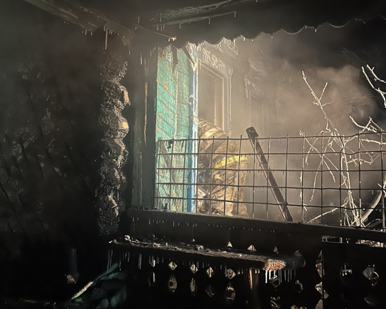 Аккуратный деревянный одноэтажный резной дом горел изнутри и пламя уже перекинулось на кровлю. Почти час огнеборцы заливали водой горящее жилище, к этому времени огонь прошел 70 квадратных метров. Судя по фото, пламя почти целиком выжгло жилище изнутри.