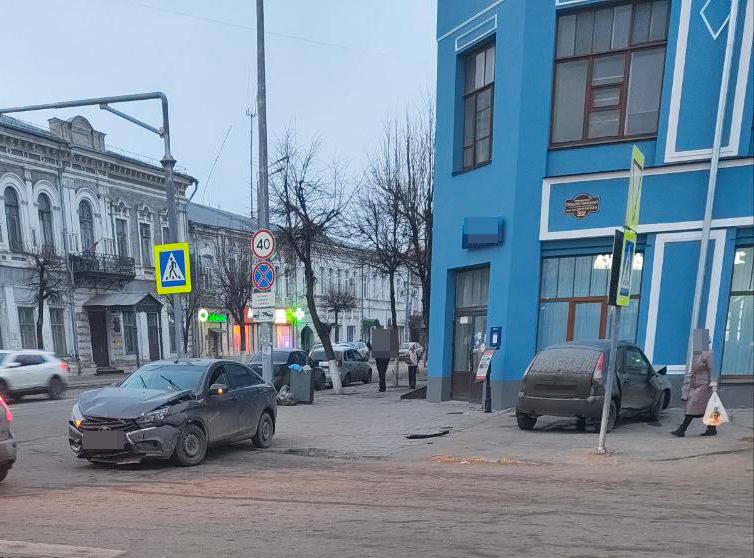 Участниками аварии стали Лада Калина и Лада Веста. На фото видно, что столкновение было жестким: Калину от удара выбросило в зданию Главпочтамта. У машины смяты двери и пороги с правой стороны.