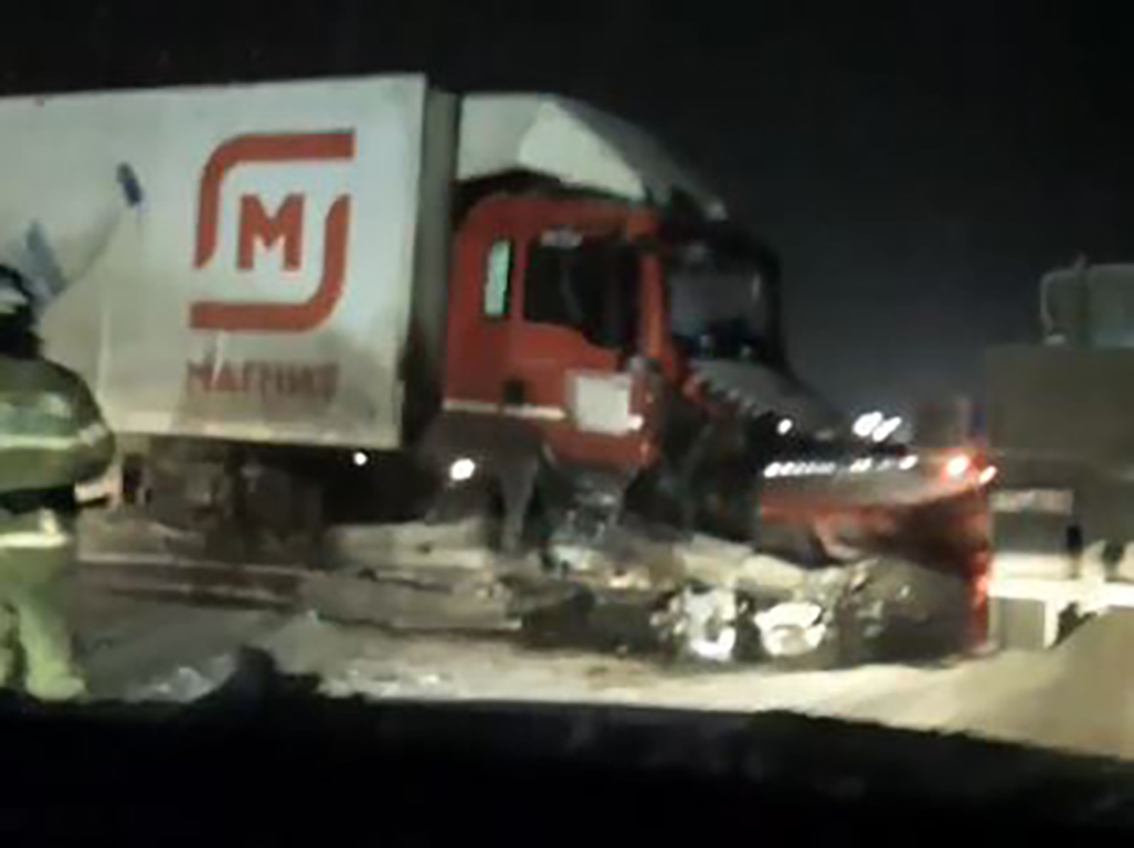 По имеющейся информации, около шести часов вечера на 998 километре автодороги столкнулись несколько автомобилей - фура «Магнит», как минимум еще один большегруз и BMW X5. Грузовик сетевого магазина снес металлические дорожные ограждения и встал поперек дороги.