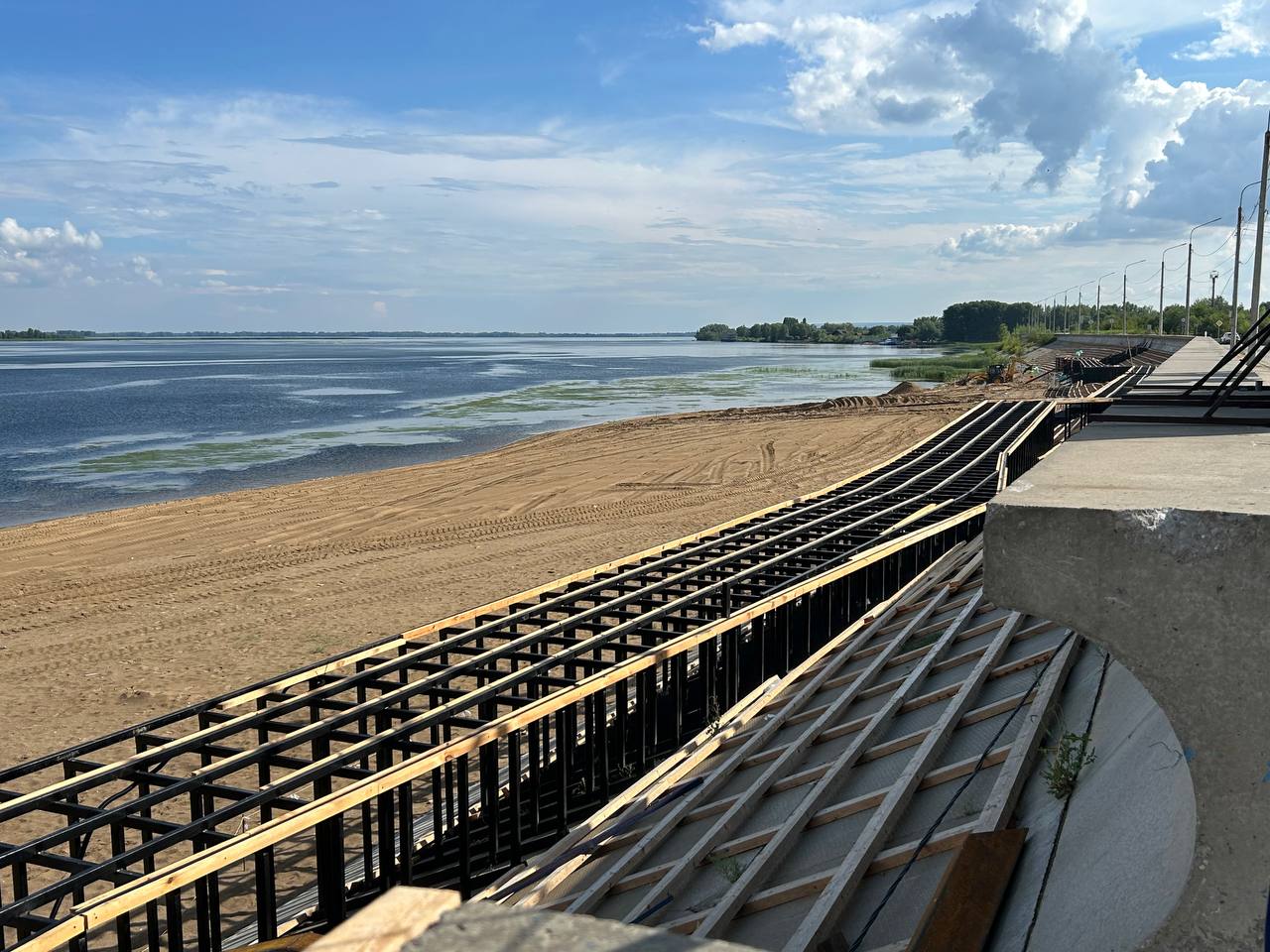Кроме того, на бетонной дамбе уже почти полностью смонтирован каркас из профильных труб: конструкция протянулась вдоль всего пляжа. Это - будущая лестница и смотровая площадка.