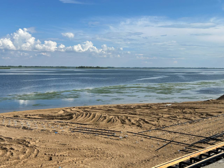 В конце пляжа уже установлены сваи, которые, вероятно, будут использоваться для организации подхода к воде.