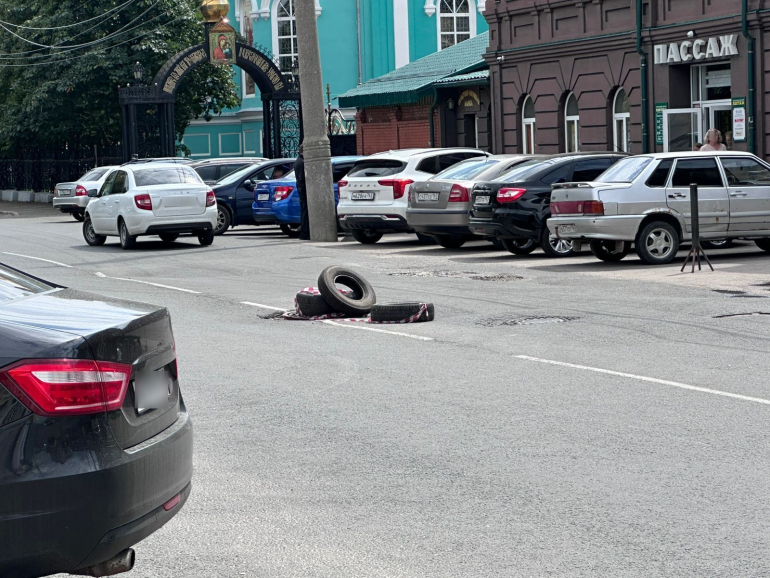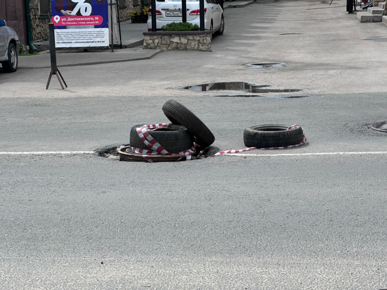 В качестве временной меры местные закидали опасное место тремя автомобильными покрышками.