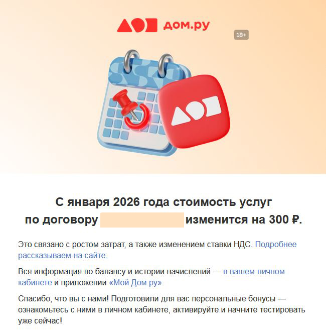 Российский провайдер «Дом.ру» начал предупреждать клиентов о повышении стоимости ряда услуг с января 2026 года. Цены на пакетные предложения в ряде случаев могут вырасти более чем на 10 процентов.