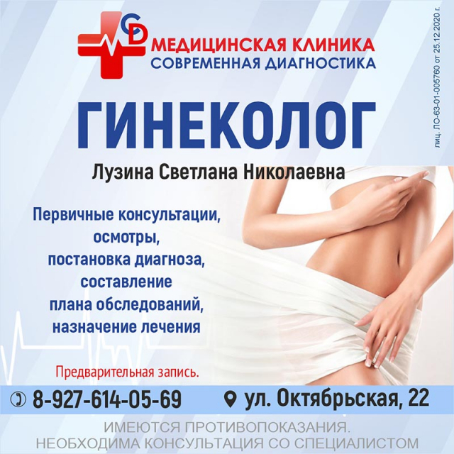 «Женское здоровье в надежных руках». Так характеризует руководство сызранской клиники «Современная диагностика» работу опытного гинеколога Светланы Лузиной. Со своими «женскими» проблемами жительницы Сызрани и соседних районов смогут обратиться к Светлане Николаевне, предварительно записавшись на прием в клинику.