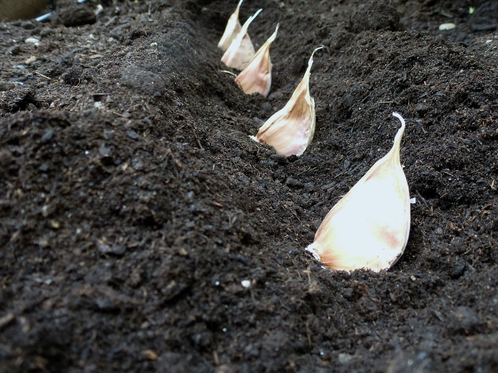 4. Борозды можно присыпать золой или песком, укладывать в них зубки через каждые 10 см на глубину около 5-6 см.Чеснок можно сажать и в 2 яруса: один зубок глубже, а второй - слегка сбоку и повыше.Так на одной площади можно получить в два раза больше урожая.