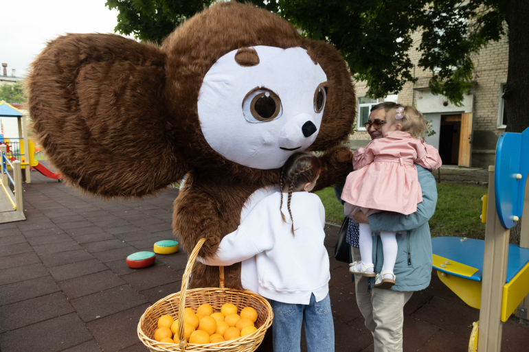 После того, как мастер-класс закончился, к ребятам пожаловал живой Чебурашка. Этот персонаж из мультфильмов, казалось, только что спустился со стены и принёс с собой корзину, полную апельсинов. Ими он щедро поделился с детьми.