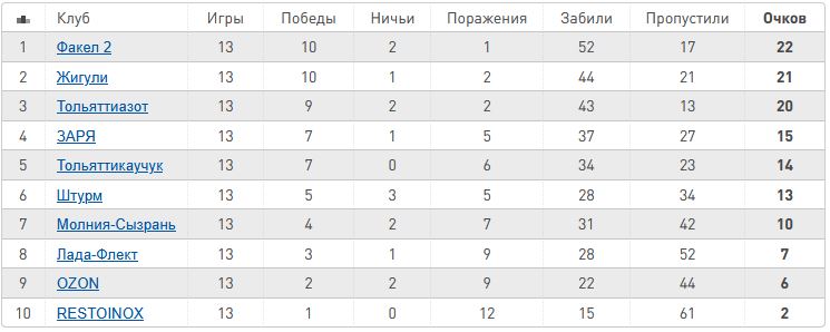Лидирует в чемпионате ТЛХЛ с 22 очками команда «Факел-2». На втором месте с 21 баллом расположился тольяттинский ХК «Жигули», команда «Тольяттиазот» с 20 очками замыкает тройку лидеров.