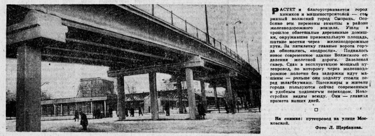 - Растет и благоустраивается город химиков и машиностроителей - старинный волжский город Сызрань. Особенно эти перемены заметны в районе железнодорожного вокзала. Ушли в прошлое обветшалые деревянные домишки, окружавшие привокзальную площадь, шаткие мостки через железнодорожные пути. За пятилетку главные ворота города обновились, «подросли». Поднялось новое современное здание Волжского отделения железной дороги. Зазеленел сквер, - пишет автор публикации.