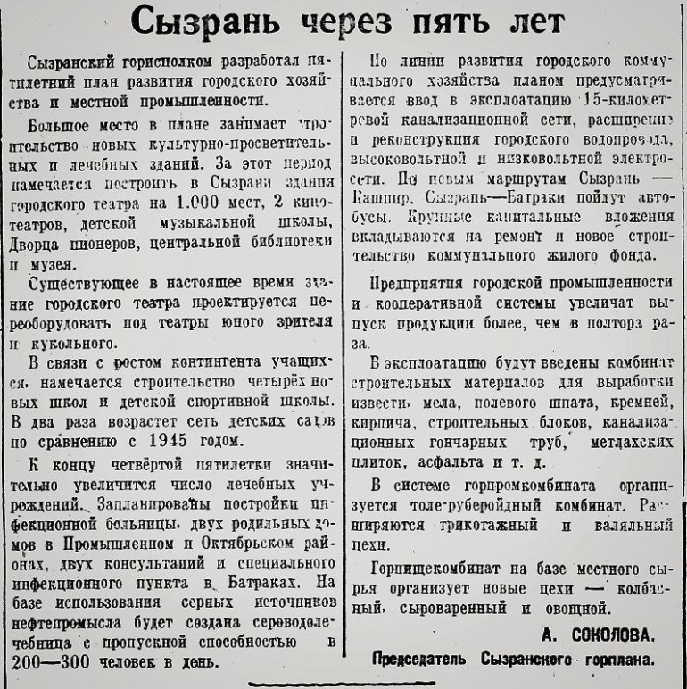 Сызранские любители истории, листая подшивки советских газет, откопали любопытную статью из «Волжской коммуны». Ровно 80 лет назад, 14 октября 1945 года, в газете вышла статья, получившая название «Сызрань через пять лет».
