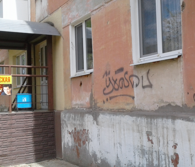 Обычная прогулка по Образцовской площадке очень встревожила жительницу Сызрани. Проходя из двора во двор, женщина заметила на домах непонятные одинаковые надписи. На первый взгляд сызранке показалось, что написано «Уходи», но потом она присмотрелась получше и поняла, что прочитать слово очень сложно.