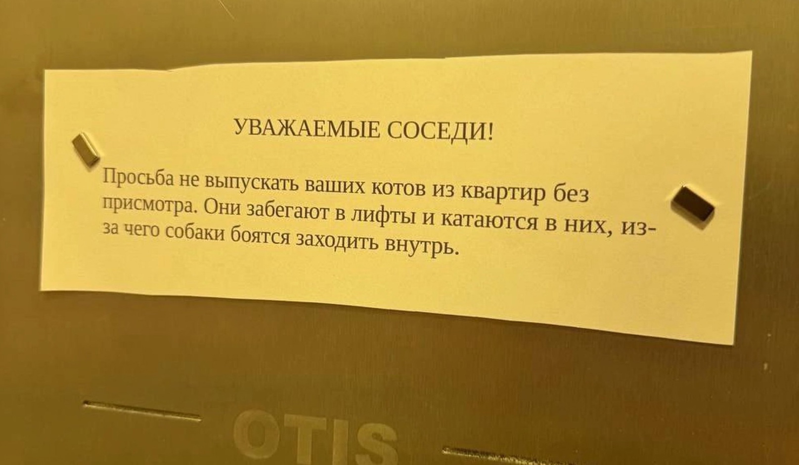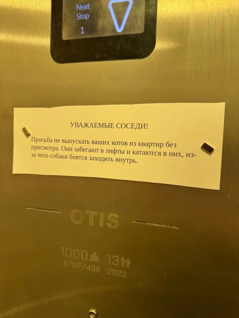 «Просьба не выпускать ваших котов из квартир без присмотра. Они забегают в лифты и катаются в них, из-за чего собаки боятся заходить в внутрь», - говорится в тексте объявления.