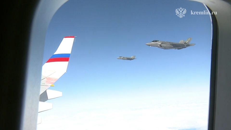 По пути с Аляски в Россию борт президента РФ Владимира Путина сопроводили американские истребители пятого поколения. Кремль публикует кадры, на которых видно, как F-22 следуют за самолетом российского лидера.