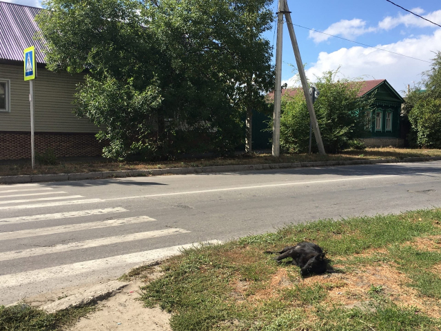 Труп собаки лежит на оживленной улице недалеко от пешеходного перехода и местные жители надеются, что коммунальщики обратят внимание на это безобразие.