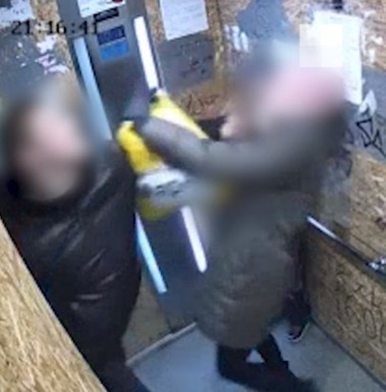 Он размахивает руками и наносит несколько ударов женщине, несмотря на то, что рядом с ней ребенок. По словам очевидцев, потом он пошел в соседний подъезд, выбил входную дверь, пытался поджечь зажигалкой камеру, а также кидался кусками льда в машины, припаркованные у дома.
