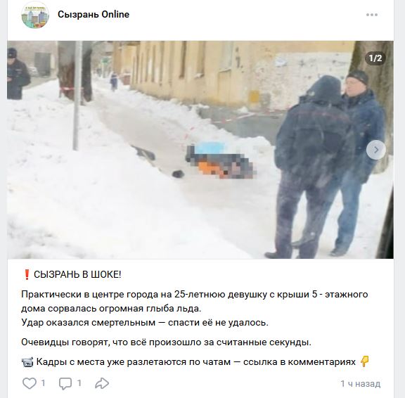 - Сызрань в шоке! Практически в центре города на 25-летнюю девушку с крыши 5-этажного дома сорвалась огромная глыба льда. Удар оказался смертельным — спасти её не удалось. Очевидцы говорят, что всё произошло за считанные секунды, - говорится в сообщении.
