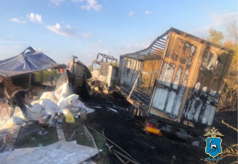После столкновения вспыхнул пожар, огонь практически уничтожил один большегруз, другой лишь частично пострадал от огня. На дорогу высыпалась мука, которую перевозила одна из машин.
