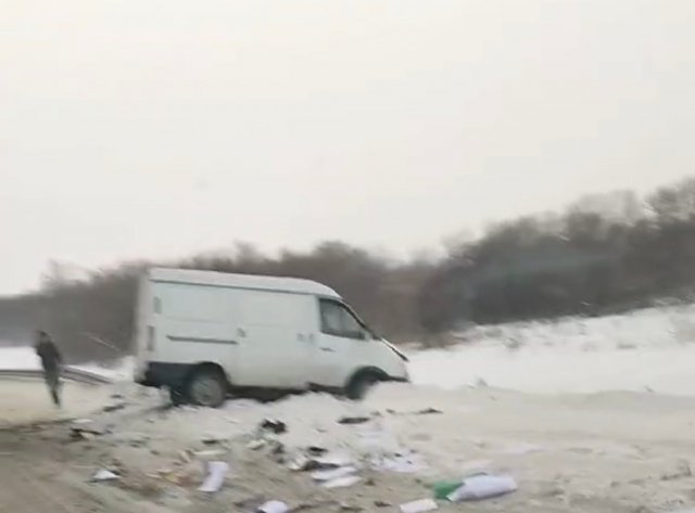 На кадрах с места аварии видно, что оба фургона от удара раскидало по обочинам. По дороге разбросана бумага. Видимо, она вылетела из одного автомобиля - участника ДТП. Легковой автомобиль с разбитым кузовом лежит в кювете.