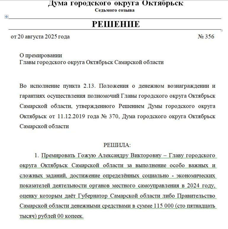 Депутаты города Октябрьска приняли решение премировать главу города Александру Гожую. Документ 20 августа подписал председатель местной думы Владимир Ревин.