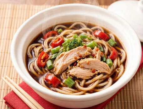 Готовое мясо достаем из бульона и процеживаем его. Остывшее мясо разбираем на волокна или нарезаем кусочками. Добавляем удон, овощи, доводим до кипения и варим еще 5 минут. Затем добавляем 4 столовые ложки соевого соуса. Посыпаем суп зеленью. Приятного аппетита желает «Поваренок.ру».