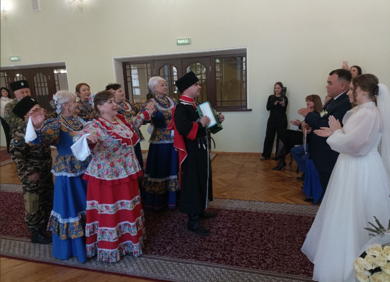 Новобрачных поздравлял творческий коллектив патриотического клуба «Казачья застава» подразделения «Оберег» города Сызрани. Они дарили молодоженам и их гостям приятные эмоции, настоящий душевный праздник и настроение, раскрыв культуру, традиции и обычаи казаков.