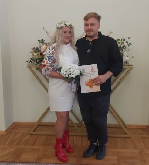 Пара выбрала русский народный стиль для своих свадебных образов. На снимках, которые опубликовали сотрудники ЗАГС, видно, что невеста в платье с расшитыми рукавами, её голову украшает венок из белых цветов. На ногах у Тамары красные высокие ботинки на каблуке. На Руси именно красные сапожки считались праздничной обувью. Жених в черной стилизованной рубашке.