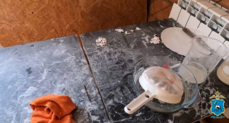 Во время обыска полицейские обнаружили и изъяли свыше двух килограммов мефедрона, канистры с прекурсорами, общий вес которых превысил 154 килограмма, а также лабораторное оборудование.
