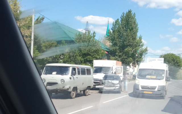 Сегодня днем, 1 июня, в Сызрани на улице Декабристов во втором часу дня рядом с мечетью собрался "паровозик" из трех машин. Столкнулись Калина, УАЗ-буханка и грузовой Мерседес.