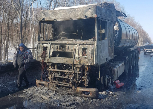 Водитель во время движения почувствовал запах гари и успел покинуть кабину, после чего тягач загорелся. По словам очевидца происшествия, сгорели кабина и передние колеса грузовика. По счастливой случайности огонь не добрался до опасного груза - в цистерне находились 24 тонны нефтепродуктов.