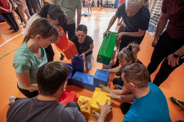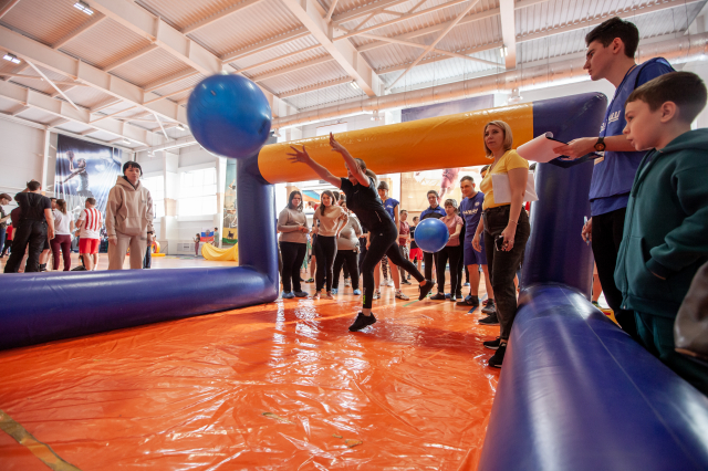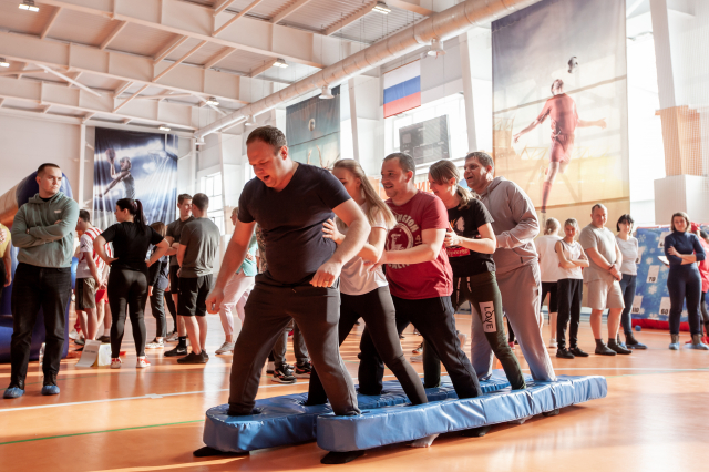 Взрослым пришлось посложнее: пройти все приготовленные для них испытания и победить оказалось задачей не из легких. Ведь боулинг здесь был непривычный, а с огромными кеглями, лыжи непростые, а командные, а ещё дартс, «Снайпер», «Конструктор» и даже плавание.