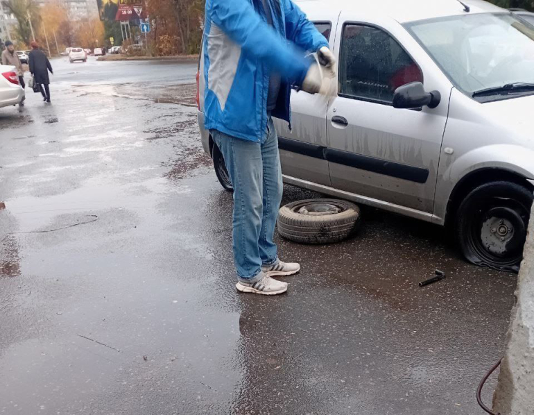 Так, водитель за рулем «Лада Ларгус» влетел в яму передним правым колесом. Пришлось заниматься ремонтом прямо на месте. Ехать в шиномонтаж водителю придется в любом случае и ремонт колес сегодня стоит недешево.