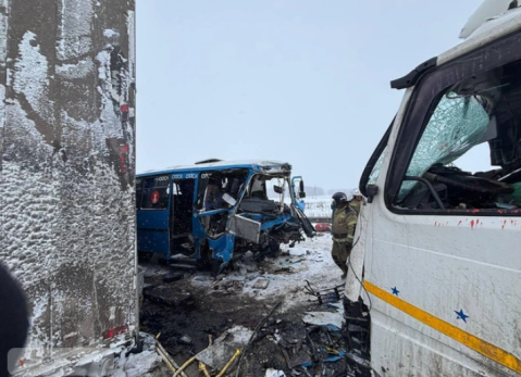 На кадрах с места ДТП видно, что от передней части автобуса почти ничего не осталось.