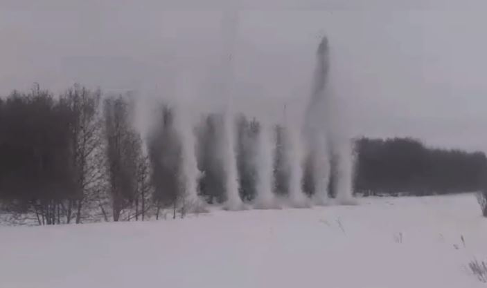 На кадрах ролика видно, как заложенные заряды в линию в момент подрываются и куски льда вместе с водой подлетают на несколько метров вверх.