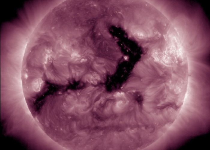 Как сообщили в лаборатории солнечной астрономии ИКИ и ИСЗФ, скорость солнечного ветра, формируемого дырой, в окрестностях нашей планеты может удвоиться и достигнуть 700 километров в секунду.