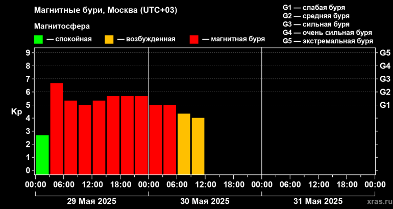 В течение двух дней, 29 и 30 мая, на Земле бушевала сильнейшая магнитная буря. Это был самый сильный магнитный шторм за последние несколько месяцев. Об этом сообщает Лаборатория солнечной астрономии ИКИ и ИСЗФ.