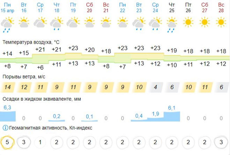 Рабочая неделя началась с магнитной бури. В понедельник, 15 апреля, уровень геомагнитной активности находится на отметке в пять баллов. 16 апреля ее интенсивность снизится до трех баллов, а в последующие дни упадет до 1-2 баллов. Такой прогноз дает Gismeteo.