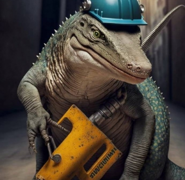 Весьма прозаично выглядит и «долбоящер». Сеть нарисовала рептилию в каске и с перфоратором. Ирония в принципе ясна.