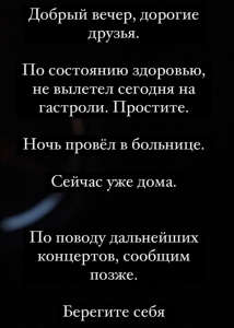 В сообщении знаменитого музыканта и лидера группы «Динамик» от 25 марта говорится: "Дорогие друзья! По состоянию здоровья не вылетел на гастроли. Простите, ночь провел в больнице. Сейчас уже дома, по поводу дальнейших концертов сообщим позже".