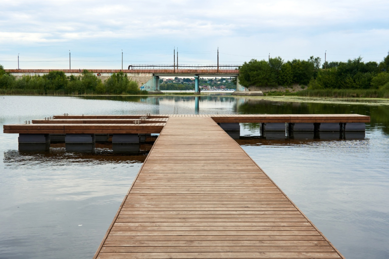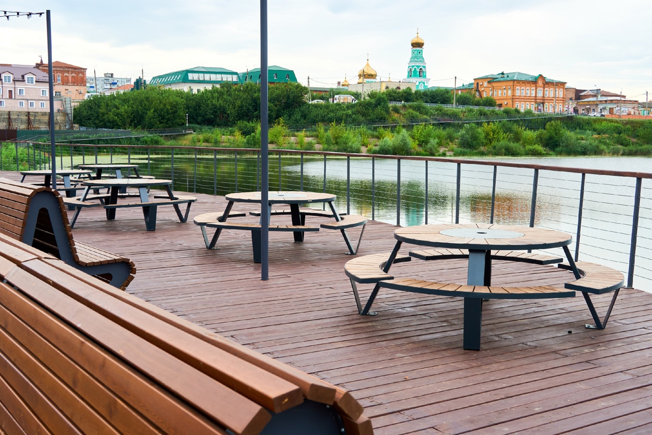 На большой прогулочной зоне были проведены новые коммуникации, возведен пирс для водного такси, установлены арт-объекты, качели, тренажеры, детская площадка и зоны отдыха, а также построены освещенные LED-подсветкой спуски к воде.