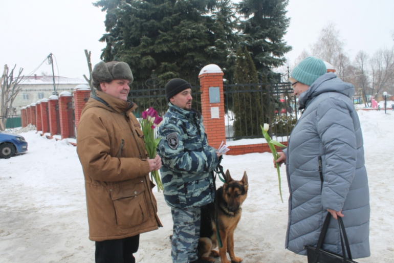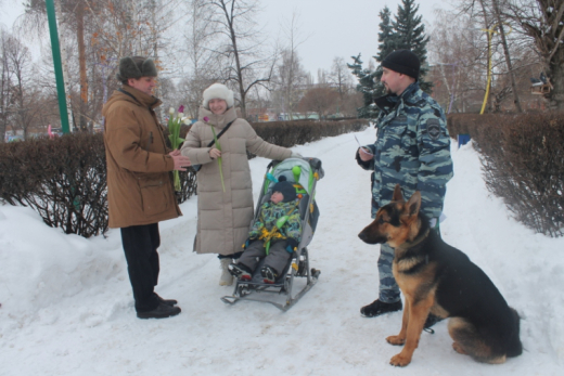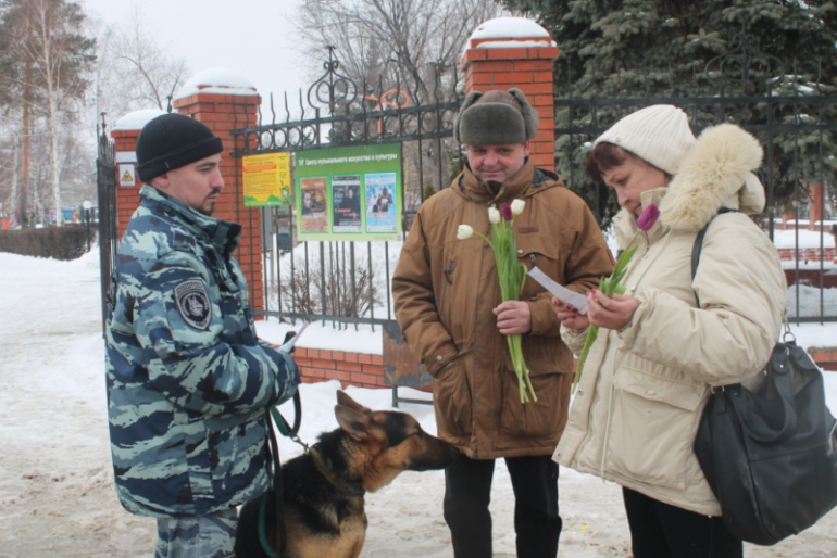 Поздравляя жительниц Сызрани с Международным женским днем, полицейские вместе со служебной собакой по кличке Эрик из самарского питомника МВД «Центр на Олимпе» и общественником вручали им цветы, а также памятки с информацией о том, как не стать жертвой мошенников. Кроме того, сотрудники полиции не забывали и о своей работе - отвечали на вопросы женщин и давали рекомендации по решению некоторых ситуаций, касающихся компетенции органов внутренних дел.