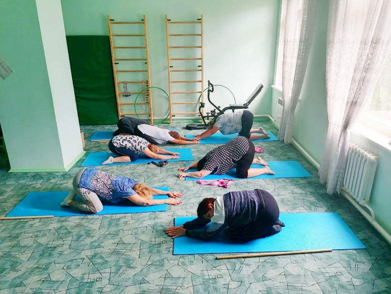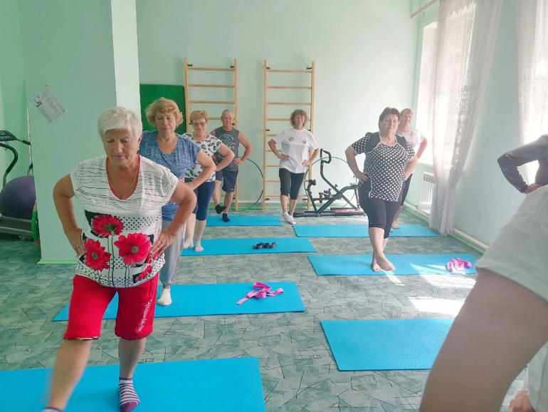 На занятиях пожилые люди с удовольствием укрепляют тело и дух.