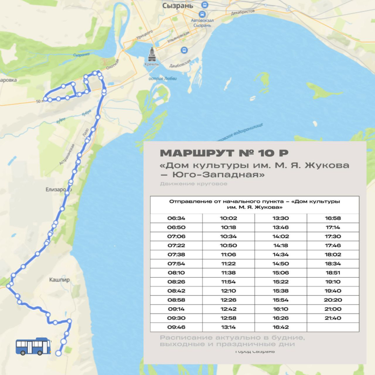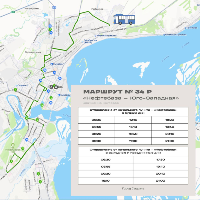 Власти Сызрани представили актуальный график и схемы движения обновлённой сети городских автобусных маршрутов. В перечень вошли рейсы № 5Р, 6Р, 10Р, 12Р, 21Р, 27Р и 34Р.