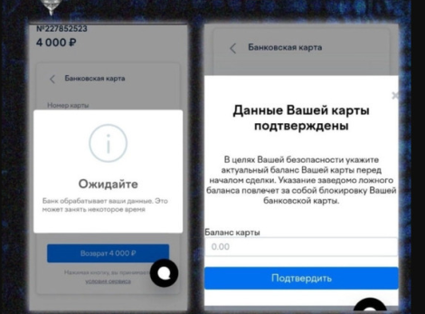 На одной карточке владельцу карты предлагается подождать, пока банк обработает его данные. В следующем сообщении говорится, что данные карты якобы «подтверждены», и предлагается указать актуальный баланс «в целях безопасности». Как правило, для страха мошенники добавляют угрозу: «Указание заведомо ложного баланса приведёт к блокировке карты».