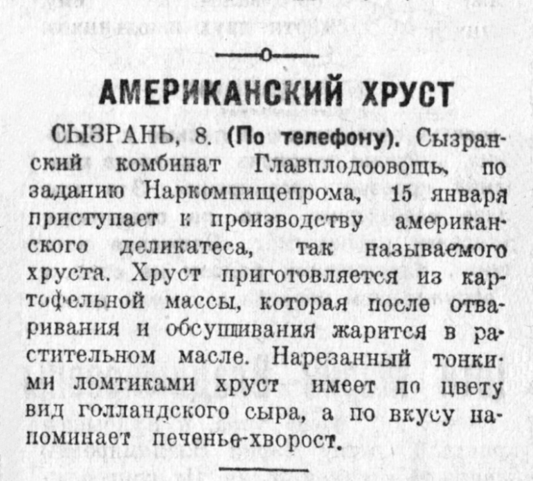 «Сызранский комбинат Главплодоовощь, по заданию Наркомпищепрома, 15 января приступает к производству американского деликатеса, так называемого хруста», - говорится в статье газеты «Волжская комунна» от 9 января 1937 года.