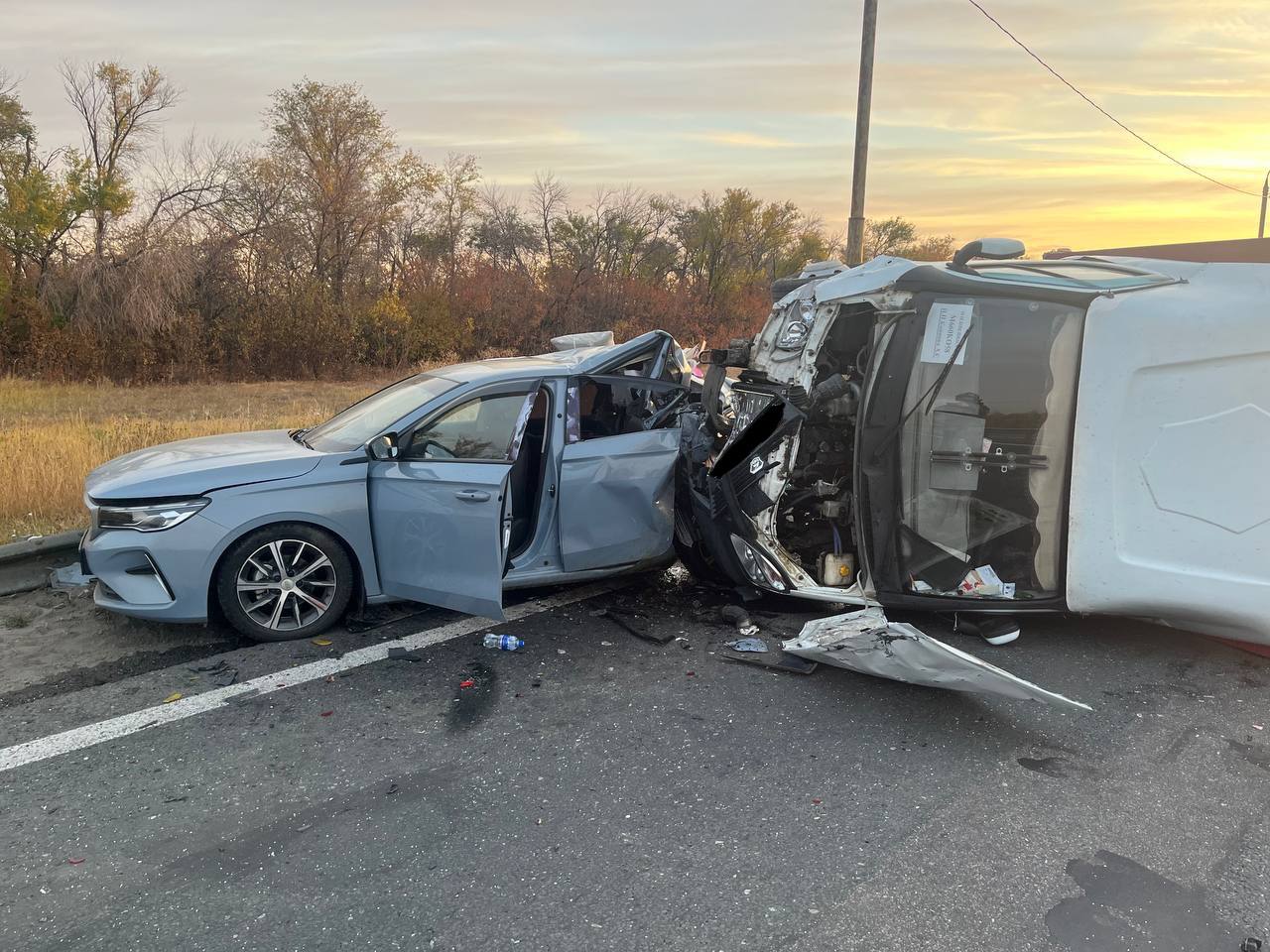 В районе развилки на село Заборовка грузовая "Газель" на высокой скорости врезалась в автомобиль "Geely Emgrand" и разбила ей багажник вдребезги. После чего грузовик завалился на бок.