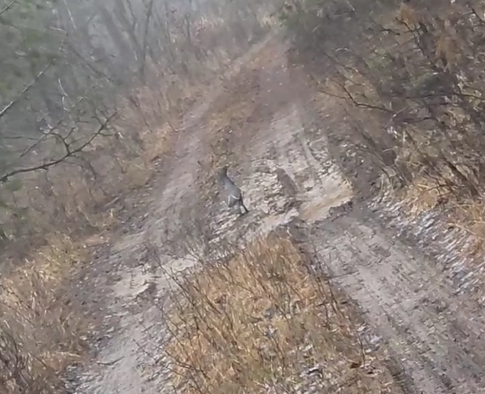 На кадрах видно, как один глухарь сидит на лесной дороге и сначала не видит людей. С дерева прилетает еще одна птица.