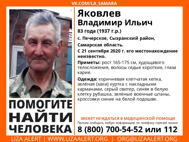 Ранее полиция объявила Владимира Яковлева в федеральный розыск. На вид пропавшему 80-85 лет, рост 165-170 см, среднего телосложения, волосы седые, глаза карие, нос прямой, на лице пигментные пятна. Всех, кто обладает какой-либо информацией о Владимире Яковлеве, просят позвонить по телефону: 8 (800) 700-54-52.