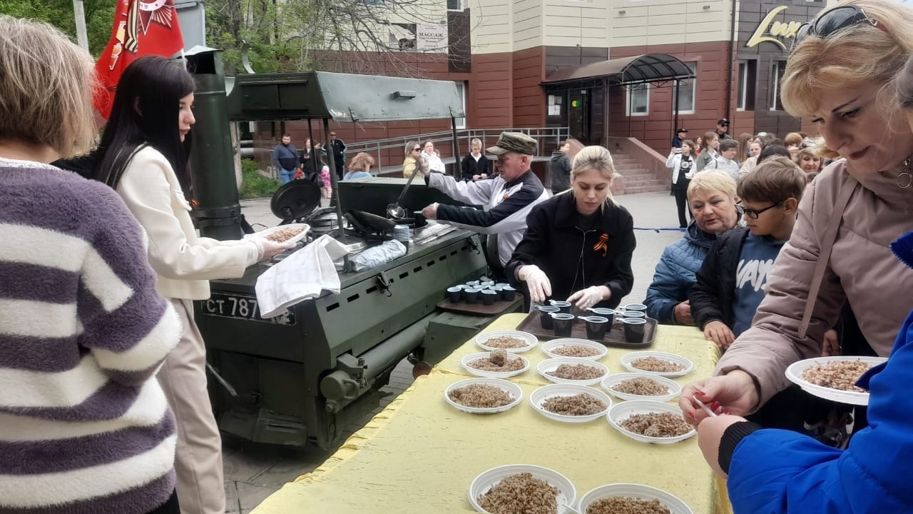 К 11 часам дня праздничное действо переместилось на площадку у ДК «Железнодорожник», где была развёрнута полевая кухня и все желающие могли отведать настоящей солдатской каши.