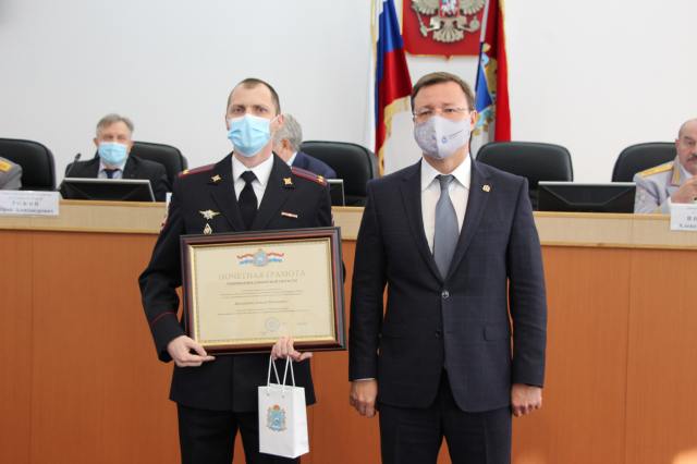 Почетную грамоту за образцовое выполнение служебного долга, большой вклад в обеспечение законности и правопорядка на территории Самарской области из рук губернатора Дмитрия Азарова получил начальник отдела по контролю за оборотом наркотиков МУ МВД России «Сызранское» подполковник полиции Алексей Виноградов.