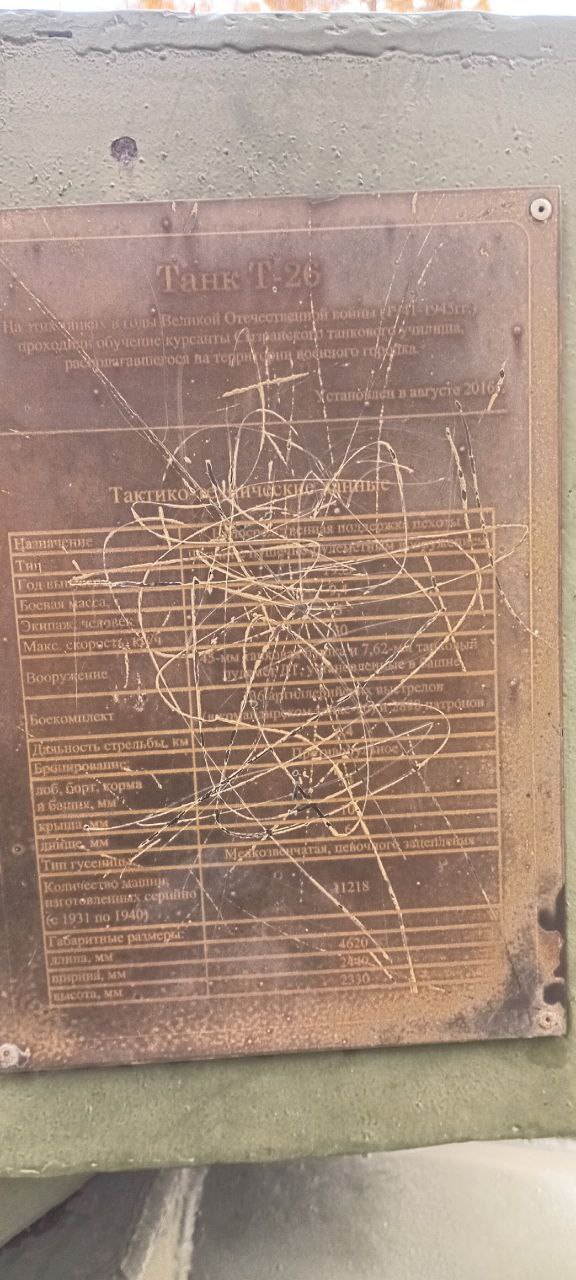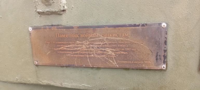 Памятник в виде танка Т-26 установлен в сквере за ДК «Авангард». Он привлекает к себе внимание как взрослых, так и ребятни. А недавно две информационные таблички на памятнике оказались исцарапанными чем-то острым, и теперь текст на них прочитать невозможно.