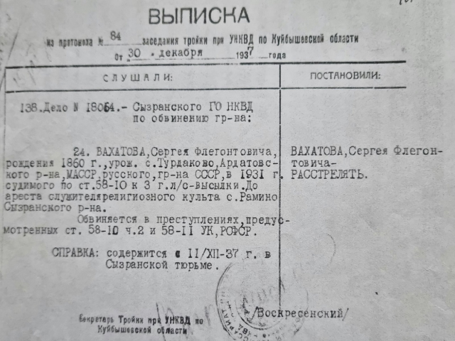 Сызранское духовенство разыскало документы из следственного дела и протокол допроса священника.